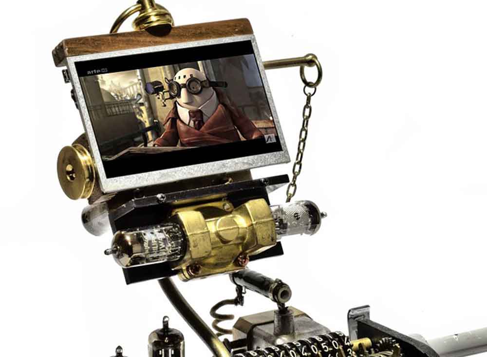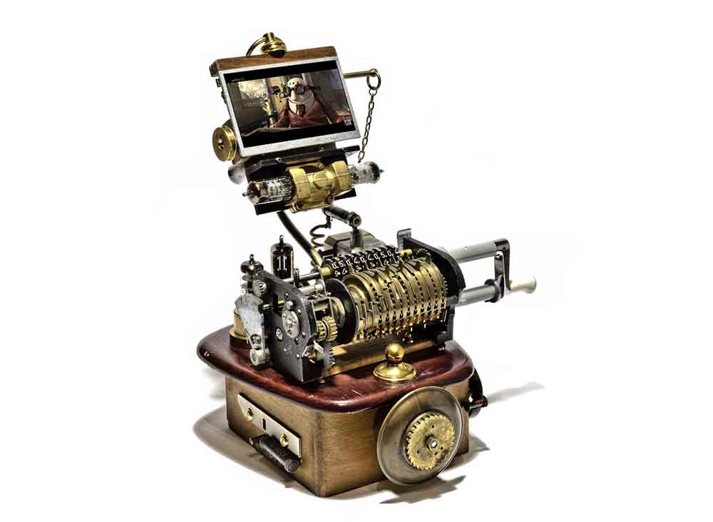 Der Künstler über seine Idee und sein Kunstwerk: "Vor kurzem bin ich in einer Recyclingmulde auf eine WatchOut Videokarte gestoßen. Abgesehen vom defekten Akku funktionierte die Karte noch einwandfrei und ich hatte schnell eine Idee, was man aus einem solchen Video-Modul auch noch kreieren könnte."Captain Nemo's Schreibtisch Kinematograph" ist mein aktuellstes Werk und besteht aus verschiedensten antiken Komponenten der vergangenen 100 Jahre. Das Herz ist Ihr Video-Display, betrieben mit einem kleinen Netzadapter."