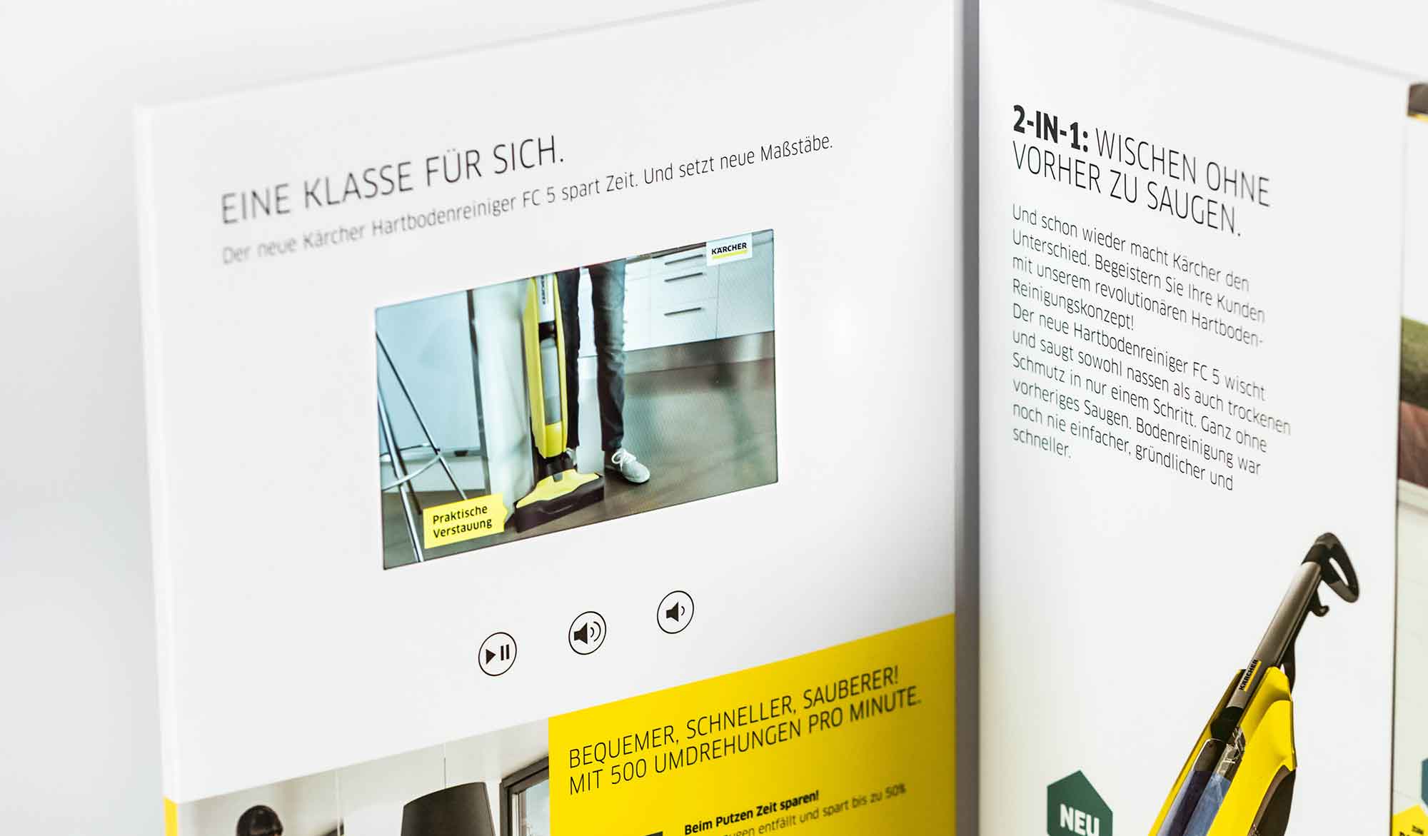 4-seitige Broschüre mit Videocard / Touchscreen perfekt für das erreichen der Kunden vor Ort. Zusätzlich, durch den 7" Display mit IPS-Auflösung, werden gestochen scharf direkt in den Filialen Inhalte an Interessierte vermittelt.